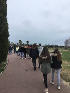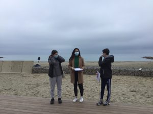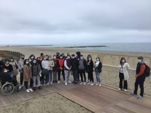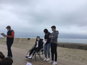 Sur la plage de Saint-Cyprien, où du 8 février 1939 au 19 décembre 1940, fut installé un camp d’internement établi pour faire face à l’afflux de 453 000 espagnols qui fuyaient le régime franquiste, les élèves ont analysé des différents dessins. Chaque groupe a ensuite présenté son analyse aux autres. Avant de repartir, les élèves ont été jusqu’à la place Rodin, où , pour commémorer ce triste passage de l’Histoire, la famille d’un artiste local-François Desnoyer- a fait don à la commune d’une sculpture. Le socle de celle-ci porte une plaque rappelant la présence des camps de la plage à Saint-Cyprien.